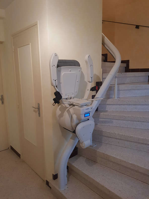 Sur recommandations de leurs voisins, qui sont aussi de fidèles clients SÉMA depuis de nombreuses années, ce couple de particuliers a fait appel à notre entreprise pour la fourniture, l'installation et l'entretien de leur chaise monte-escalier . Le modèle installé, dont le nom est « Curve », est une chaise élévatrice sur mesure qui se compose d'une assise, d'un bloc moteur et d'un repose-pied, lesquels se déplacent le long d'un double rail. Le double rail est quant à lui fixé par des pieds directement sur les marches, côté intérieur, de cet escalier en granito. L’arrivée à l’étage se fait « au dernier nez de la marche » et la rotation de l’assise s’effectue automatiquement en fin de course pour que son utilisateur puisse débarquer face au palier sereinement. Élévateur S֤ÉMA a déjà procédé à l'installation de quatre fauteuils monte-escaliers au sein de ce même lotissement situé à Guilherand-Granges , il était donc tout à fait légitime pour ce couple de solliciter notre entreprise afin de réaliser leur projet d'accessibilité. En savoir plus sur le Parrainage Lire l’Histoire de notre entreprise Retour sur les réalisations « accessibilité » de SÉMA -