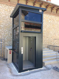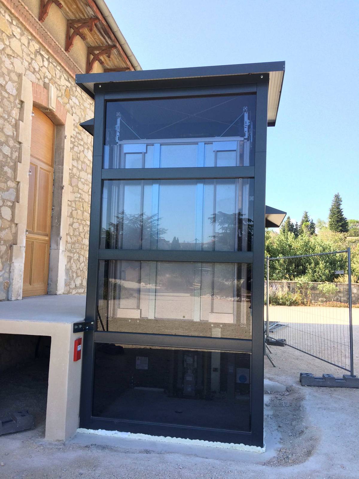 Pour la mise en conformité de l'accessibilité du Château PRADELLE à Bourg Saint Andéol, l'entreprise SÉMA a procédé à l'installation d'un élévateur avec sa structure autoportante, modèle E10 « ECO VIMEC » de la marque VIMEC.