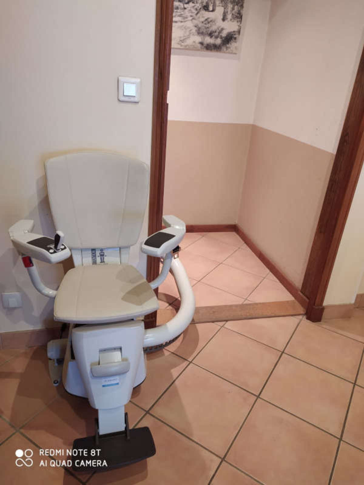 Dans cette configuration, le départ est un parking à 180° en bas à gauche de l’escalier et l’arrivée se fait sur le palier plat en haut à gauche de l’escalier. En restant appuyé sur la commande, une fois la destination atteinte, le siège pivote automatiquement grâce à sa motorisation permettant une montée en marche arrière pour être installé dans des escaliers ou dans des passages étroits comme vous pourrez le voir sur les photos.