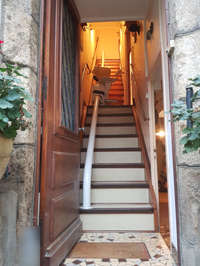 Dans cette configuration d’escalier avec une porte d’entrée proche de la montée d’escaliers, le départ du rail doit avoir lieu sur la première marche pour permettre l'ouverture et la fermeture de la porte d'entrée et cette solution est possible grâce au modèle de chaise monte-escaliers « Ultimate » du fabricant Platinum.