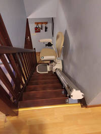 Installation chez un particulier d’une chaise monte-personne, modèle IBIZA du constructeur Platinum pour des escaliers en bois à configuration droite.