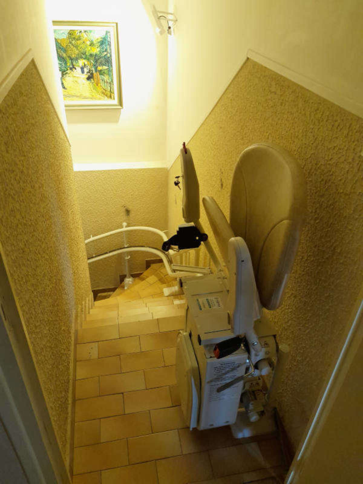 C’est le modèle « Curve » qui a été installé par notre équipe, en effet, il s’agit là d’un monte escalier, tournant et sur mesure, avec son double rail fixé directement sur les marches de l’escalier carrelé.