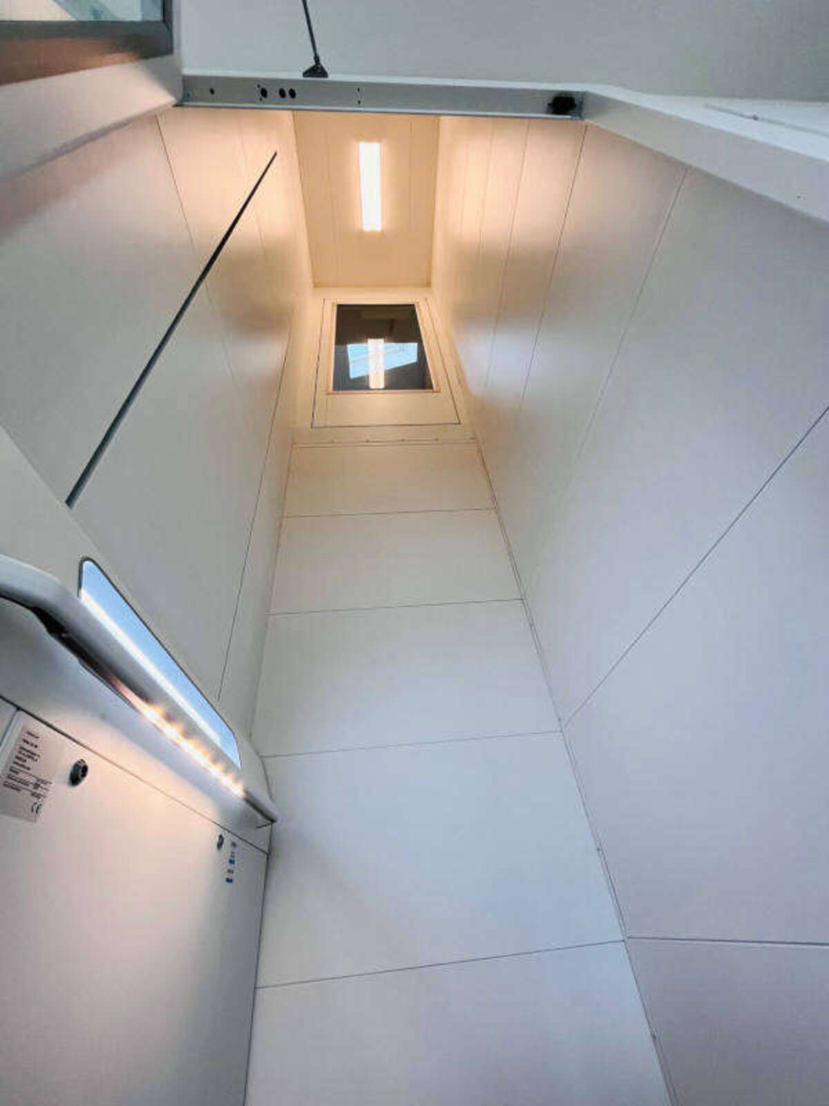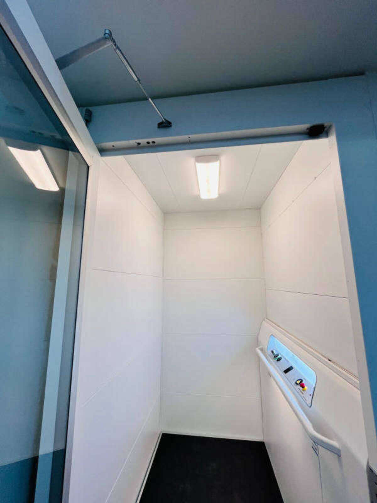 La structure, entièrement tôlée de couleur RAL 9016, intègre un plafond LED, un revêtement de sol en vinyle, et une main courante en cabine. Un KIT GSM a également été installé pour les fonctions d’appel d’urgence.