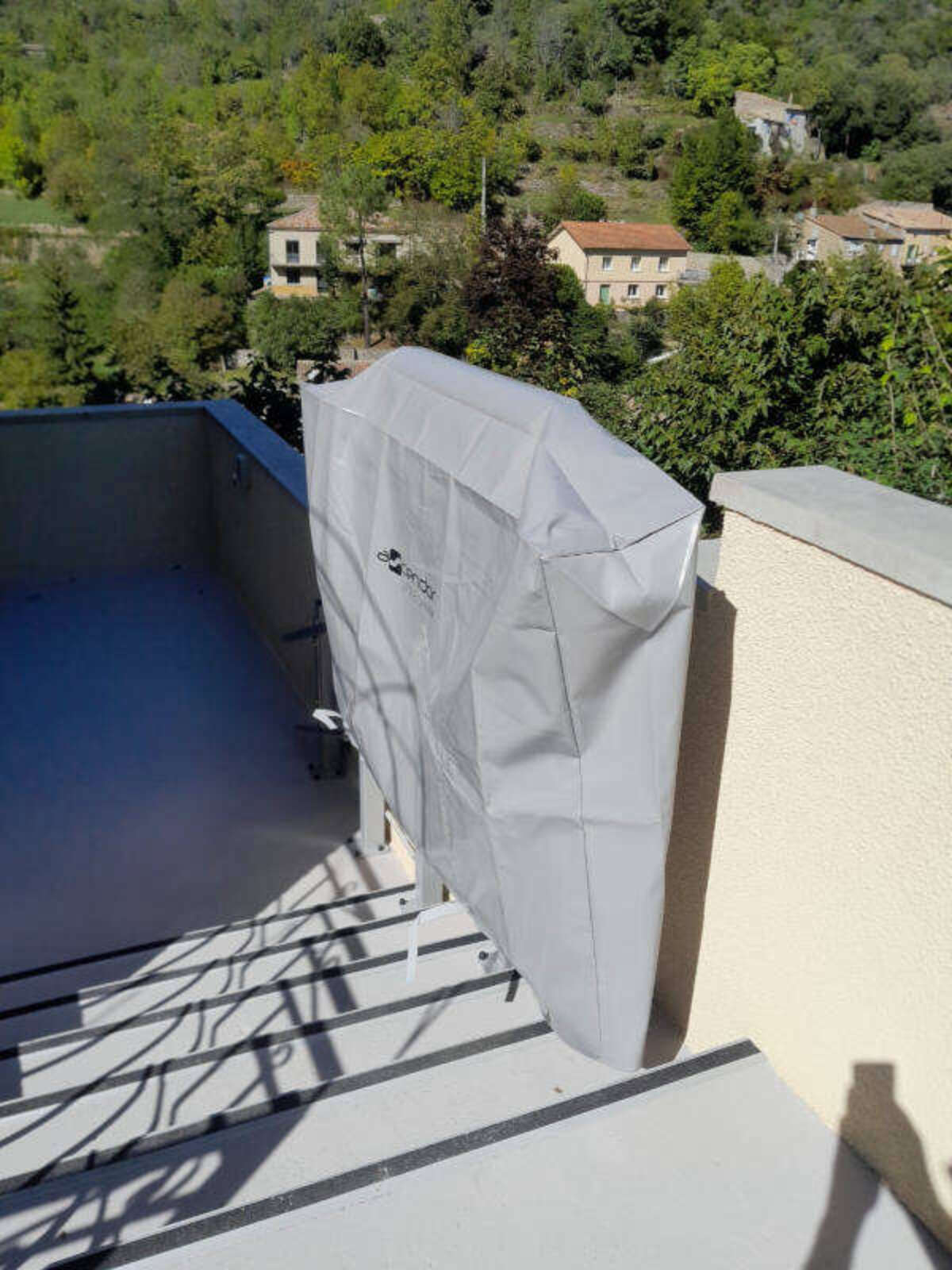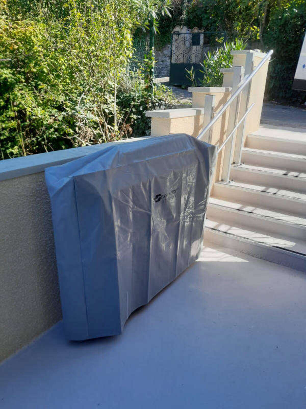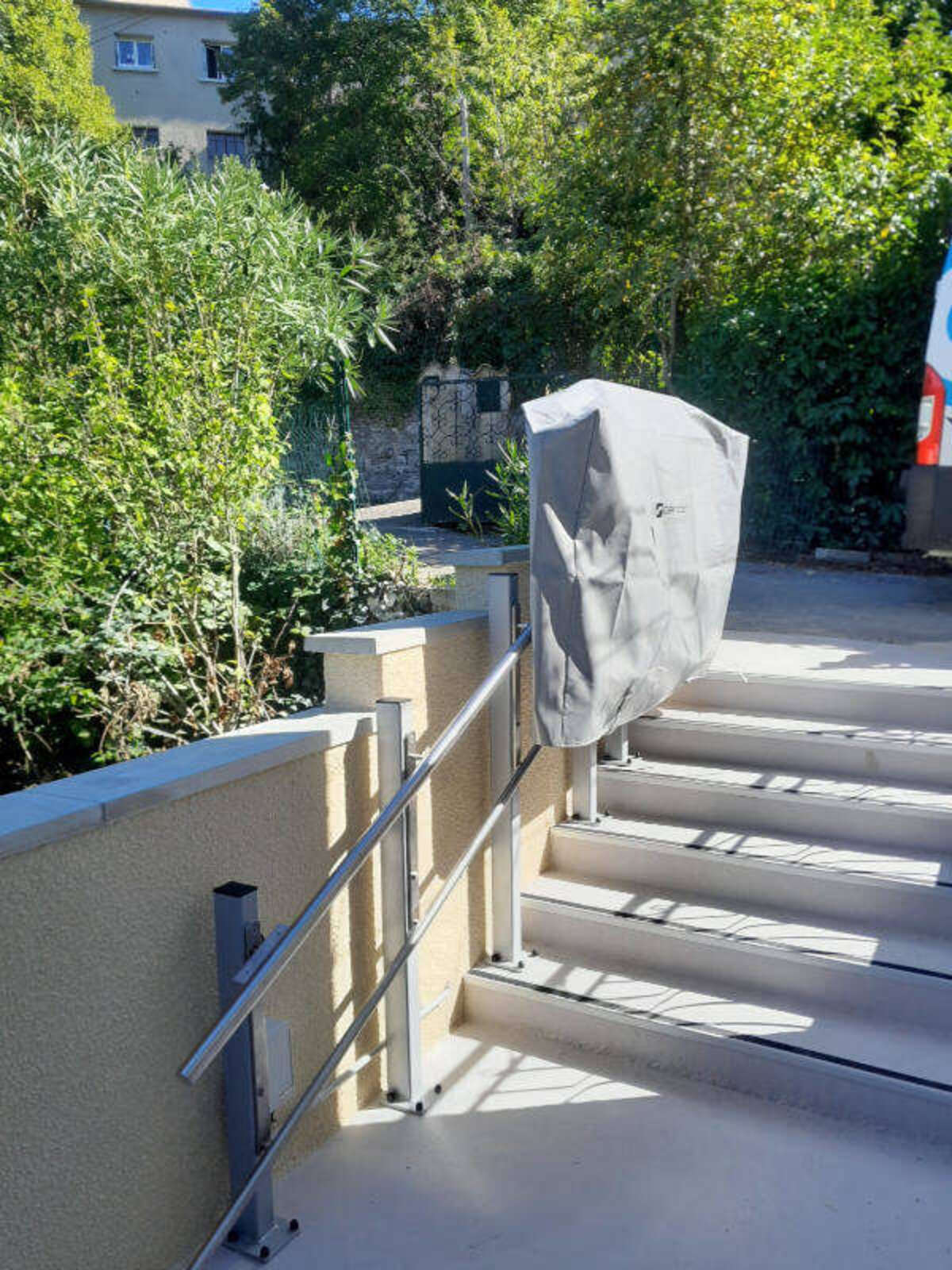 La plateforme inclinée installée mesure 1300 mm x 800 mm et repose sur un rail droit en acier inoxydable d’une longueur de 3,80 mètres. Fixée par des pieds autoporteurs, elle prend son départ en bas à gauche de l’escalier et arrive au dernier nez de marche, avec des zones de parking prévues en bas et en haut du parcours. L’ensemble est protégé par une housse adaptée aux conditions extérieures.