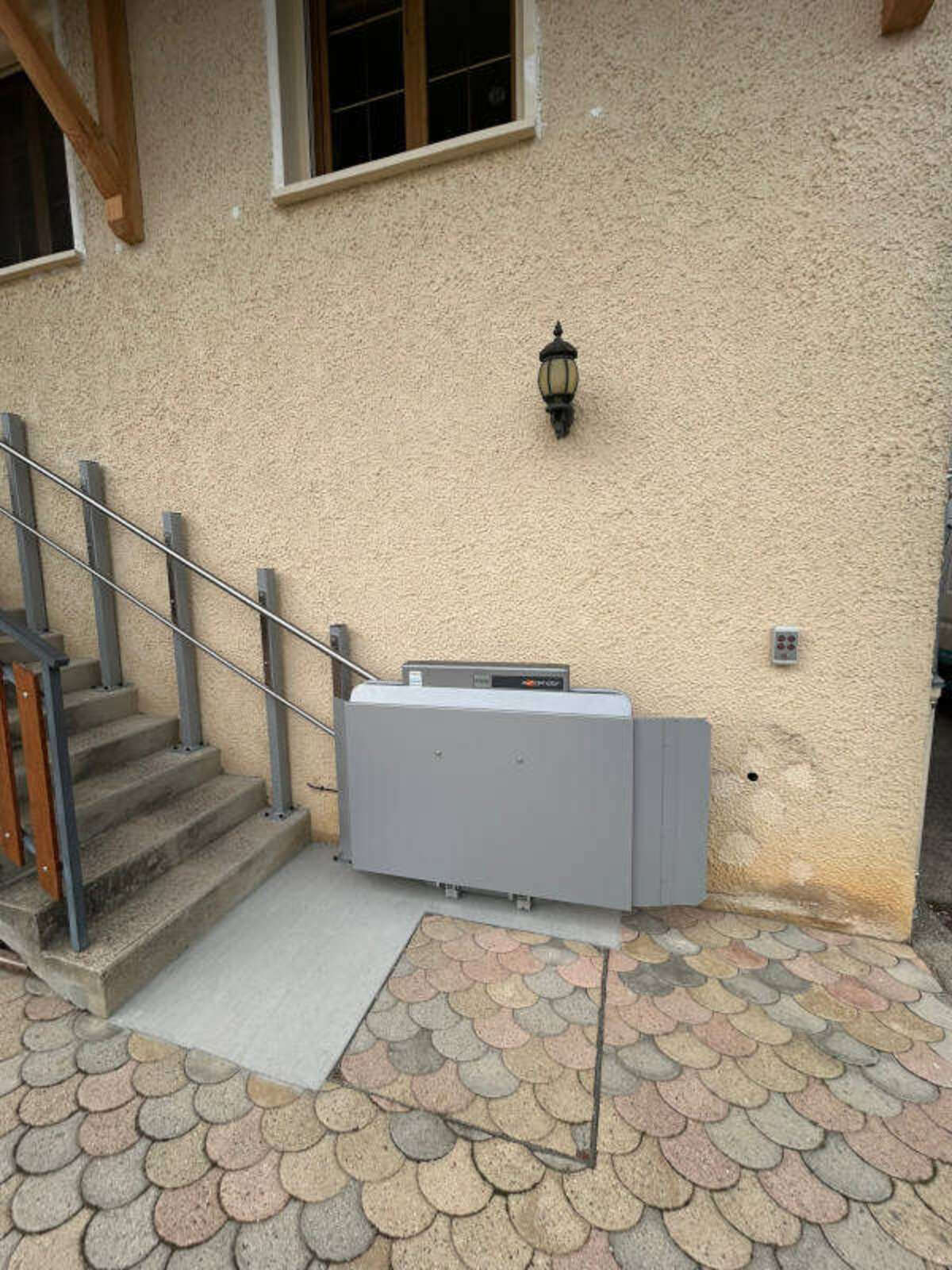 La plateforme montante, d'une dimension de 1250 mm x 800 mm, a été installée en extérieur, avec un rail double en acier inoxydable de 6200 mm. Le rail est fixé par des pieds autoporteurs, un sur les marches du côté droit de l'escalier (vu du bas vers le haut), et l'autre sur la dalle de départ. Le départ de la plateforme se situe en bas à droite de l'escalier, et l'arrivée se fait au dernier nez de marche, une nouvelle marche étant créée à cet effet.