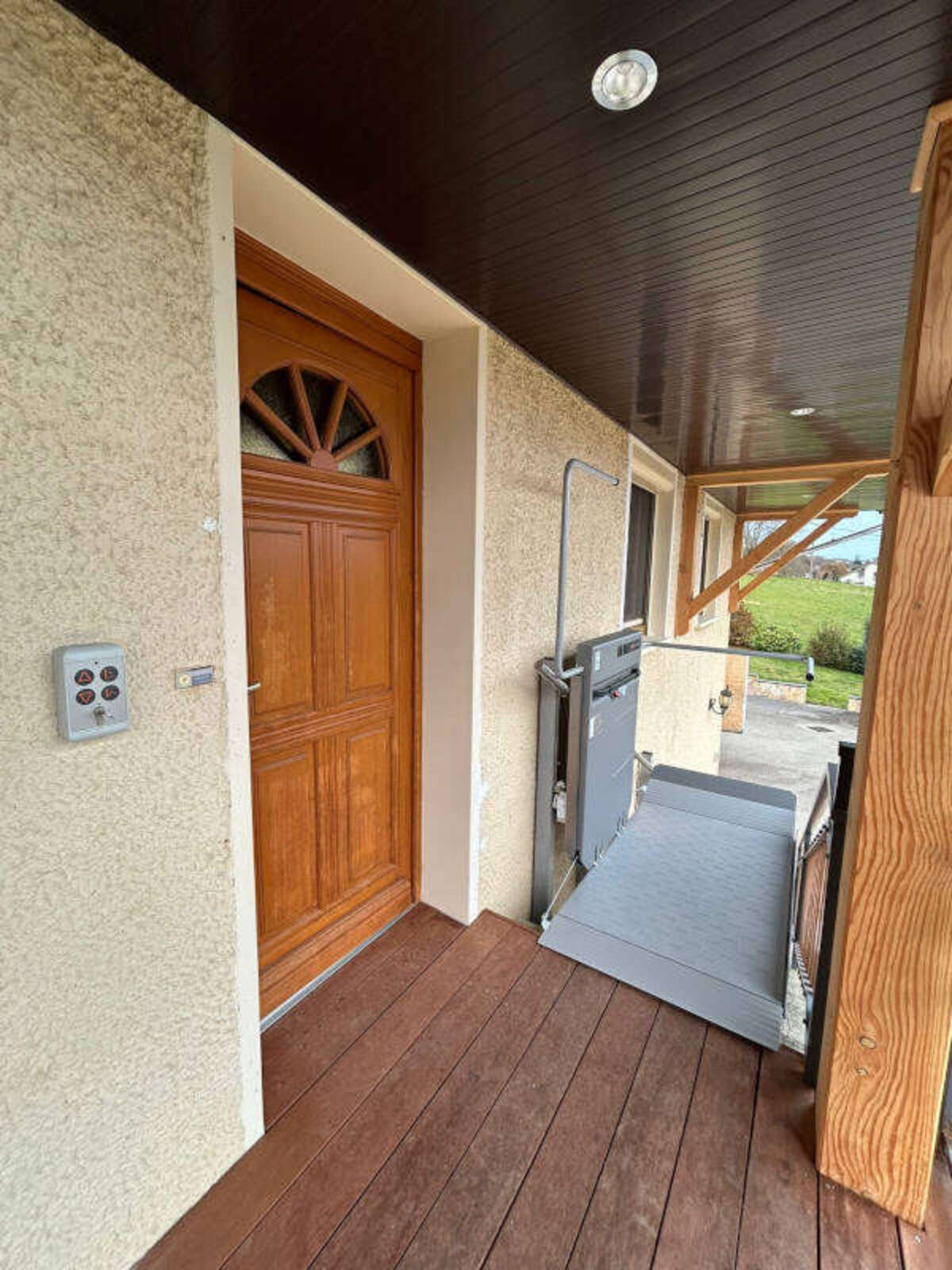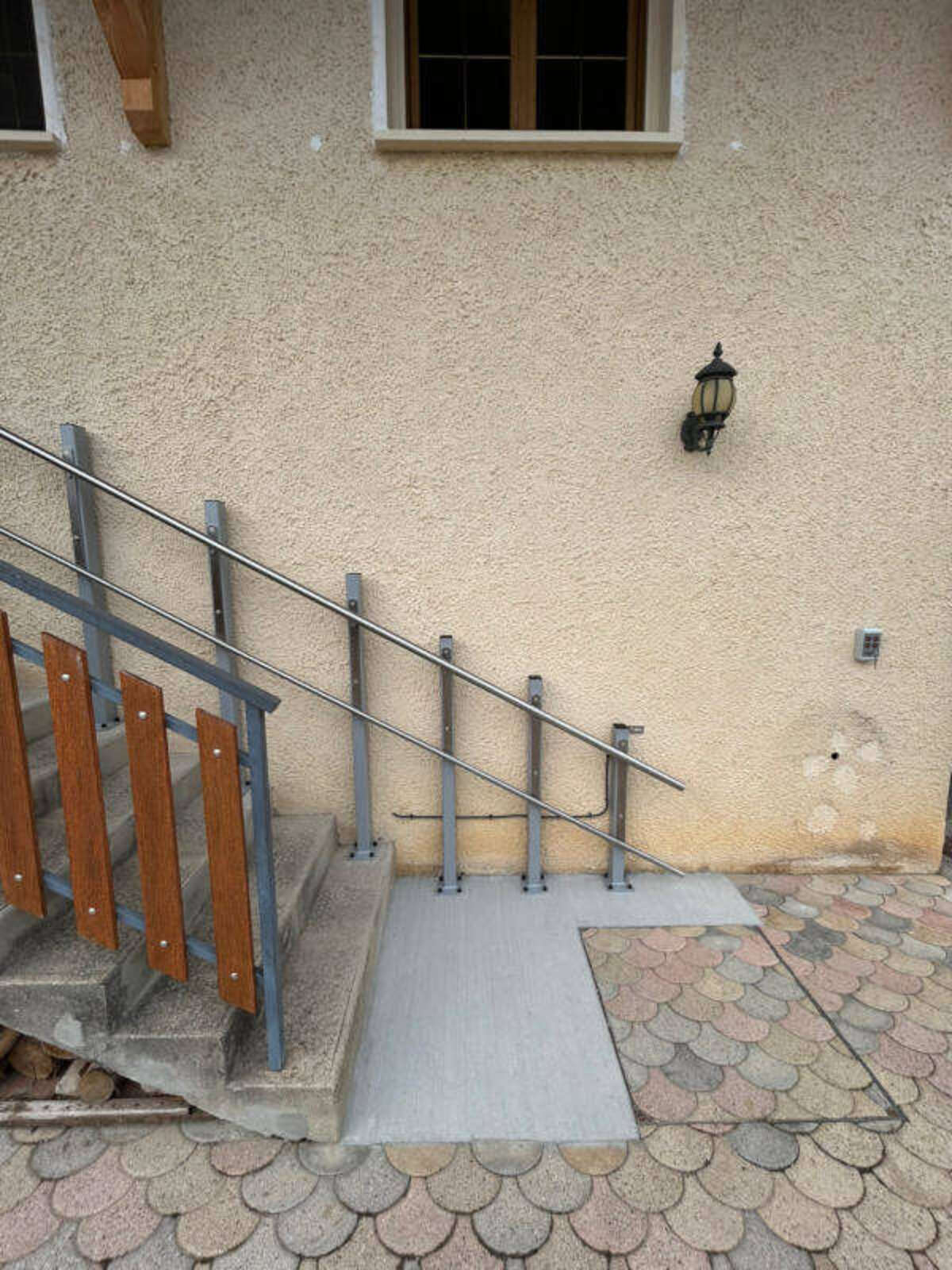 L'installation comprend également des travaux d'électricité et de maçonnerie : une alimentation électrique de 230 V a été amenée depuis le tableau général, et un palier supplémentaire a été créé pour adapter l'accès à la porte d'entrée.