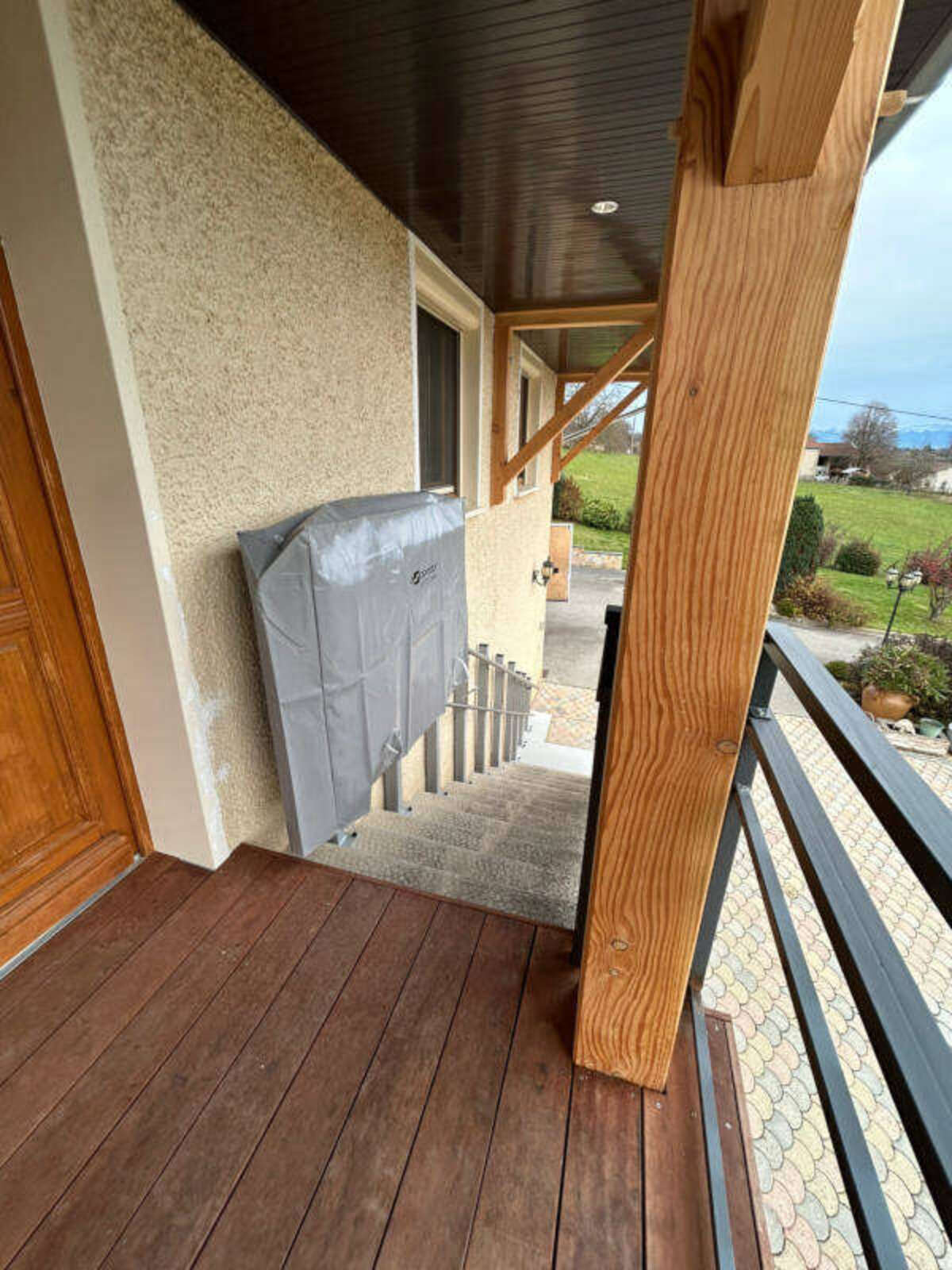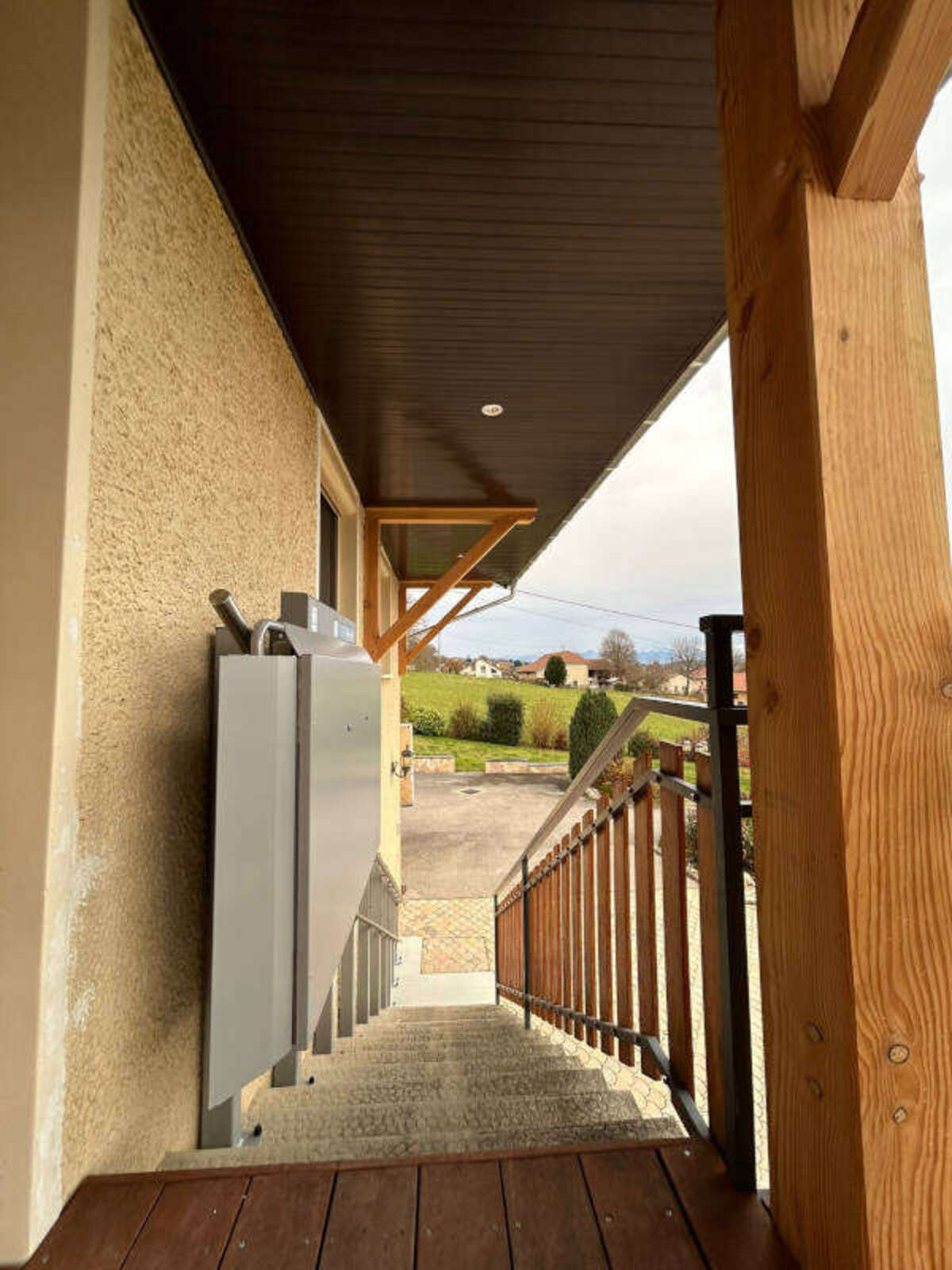 Dans la commune de Gillonay, en Isère, l'installation d'une plateforme monte-escalier a été réalisée pour un couple de particuliers afin de faciliter le transport de courses et d'objets encombrants entre leur parking et leur domicile. Cette solution a été choisie pour répondre aux besoins d'accessibilité de la maison tout en respectant les contraintes techniques de l'environnement.