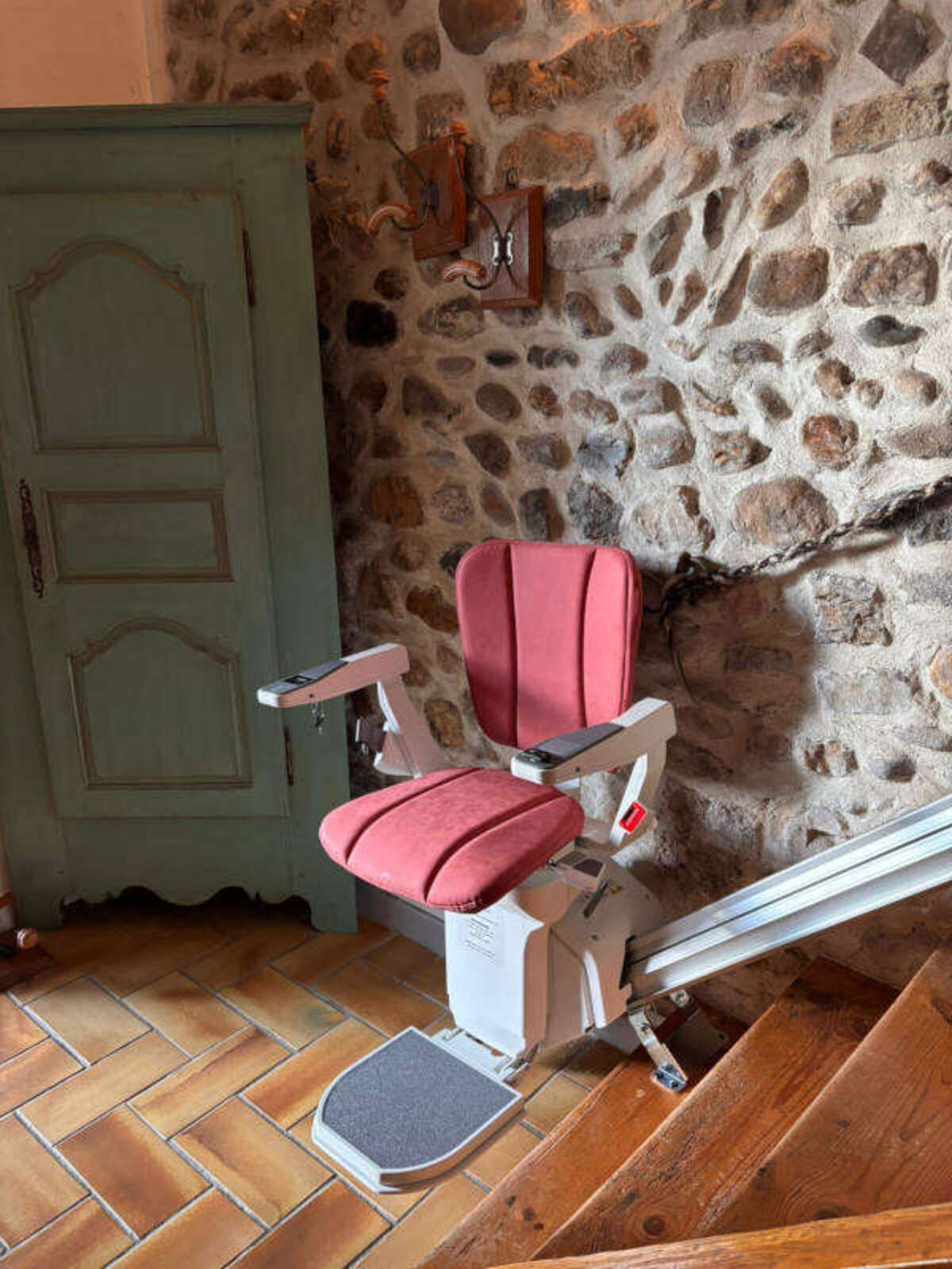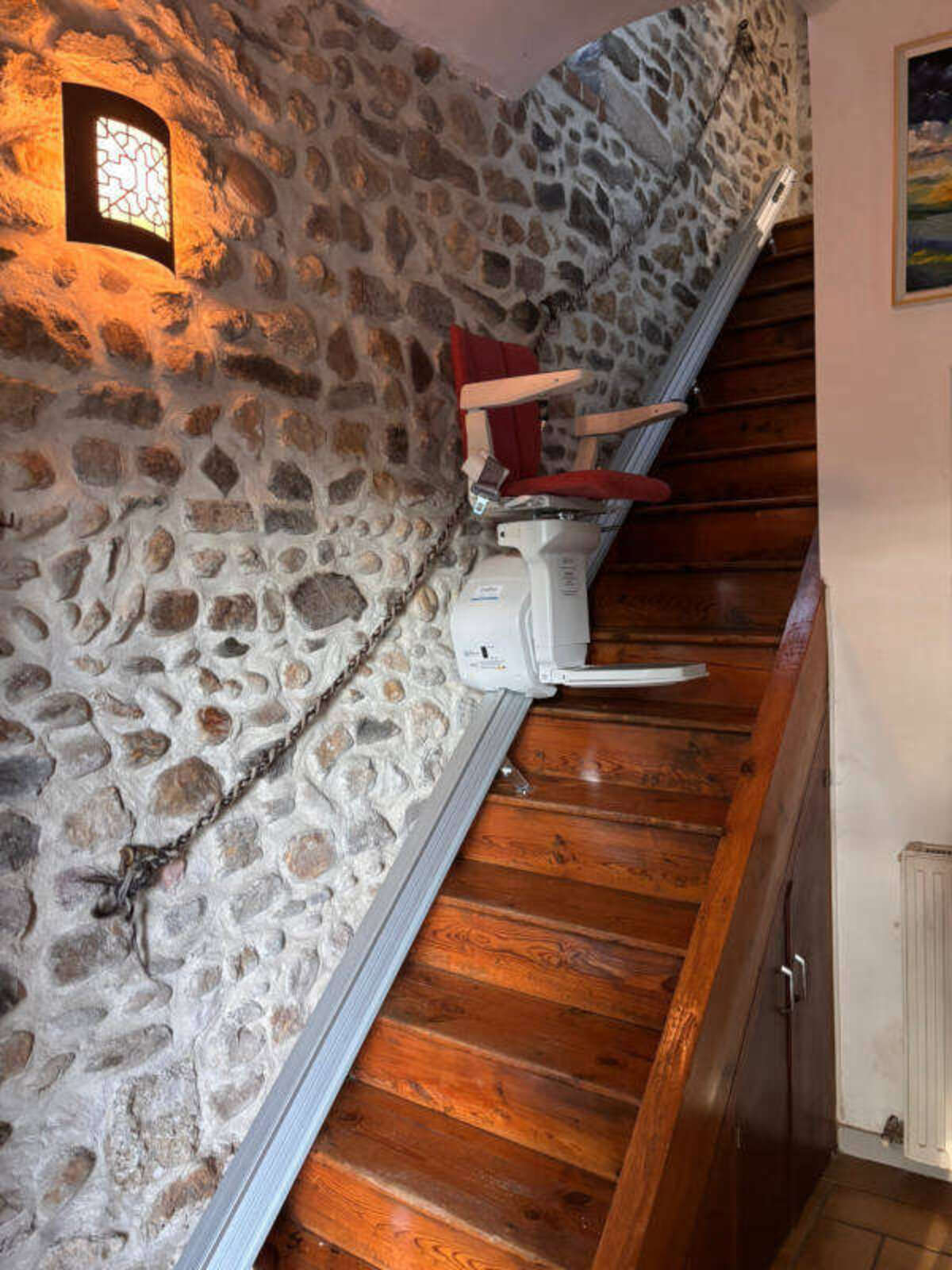 L’escalier de leur maison, ici en bois, est particulièrement long, raide et étroit, c’est pourquoi notre conseiller technique s’est naturellement orienté vers le modèle "ERGO STRAIGHT" de couleur rouge, offrant une combinaison parfaite entre performance et esthétique. Le rail rectiligne en aluminium anodisé, mesurant 4 970 mm, est fixé sur les marches du côté gauche de l’escalier, et suit un trajet parfaitement adapté à la configuration de l’escalier. Le départ du rail est standard, situé en bas à gauche (vu du bas vers le haut), et avec une arrivée au dernier nez de marche, où l’assise pivote automatiquement grâce à sa motorisation.
