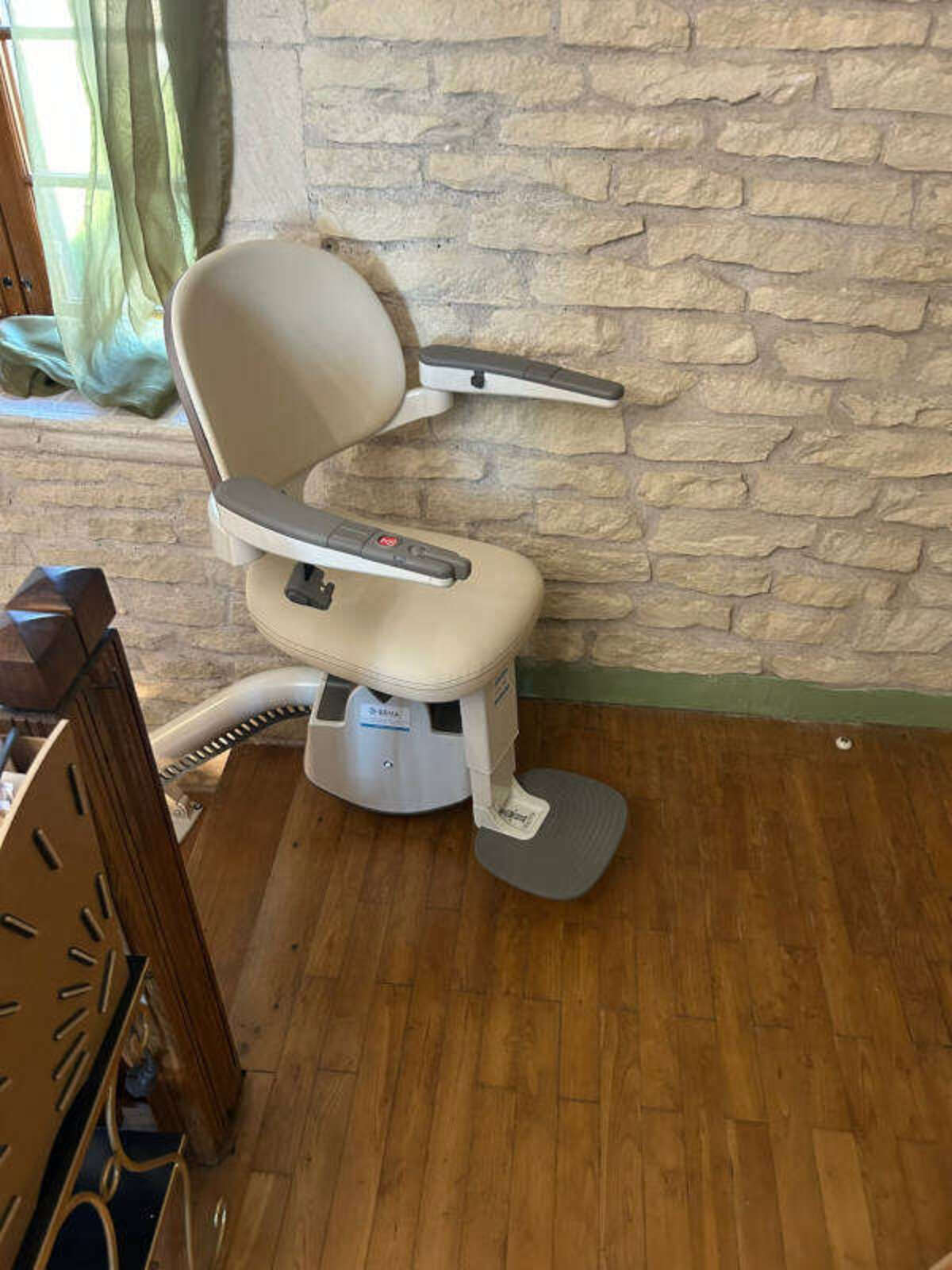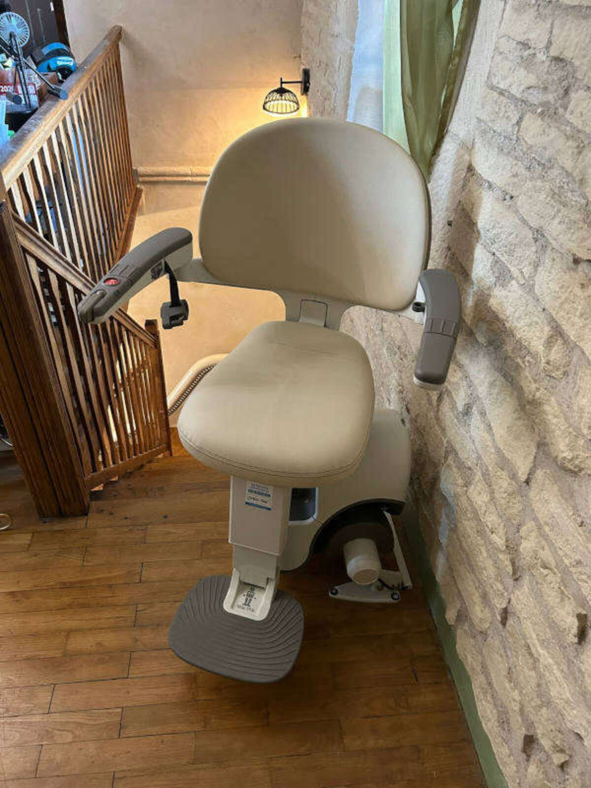 Le siège élévateur en vinyle beige naturel pivote automatiquement grâce à sa motorisation ASL, tandis que les accoudoirs réglables sur trois positions et le repose-pied repliable manuellement offrent un confort optimal. Concernant la sécurité : la ceinture de sécurité est obligatoire pour que la chaise d'escalier se déplace, et un système de secours unique accessible depuis le siège assure la tranquillité d’esprit en toute situation.