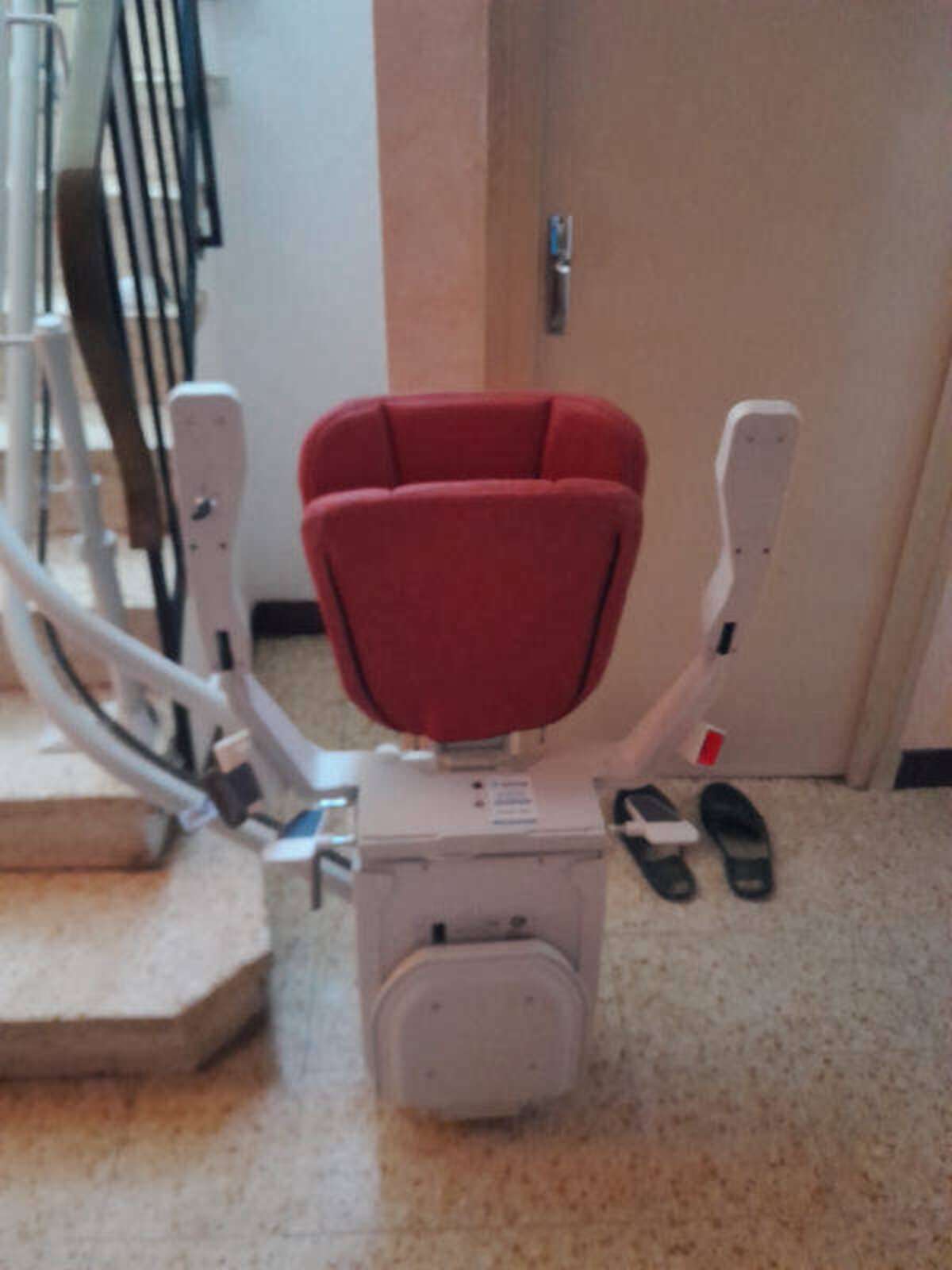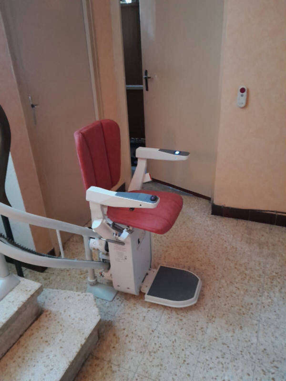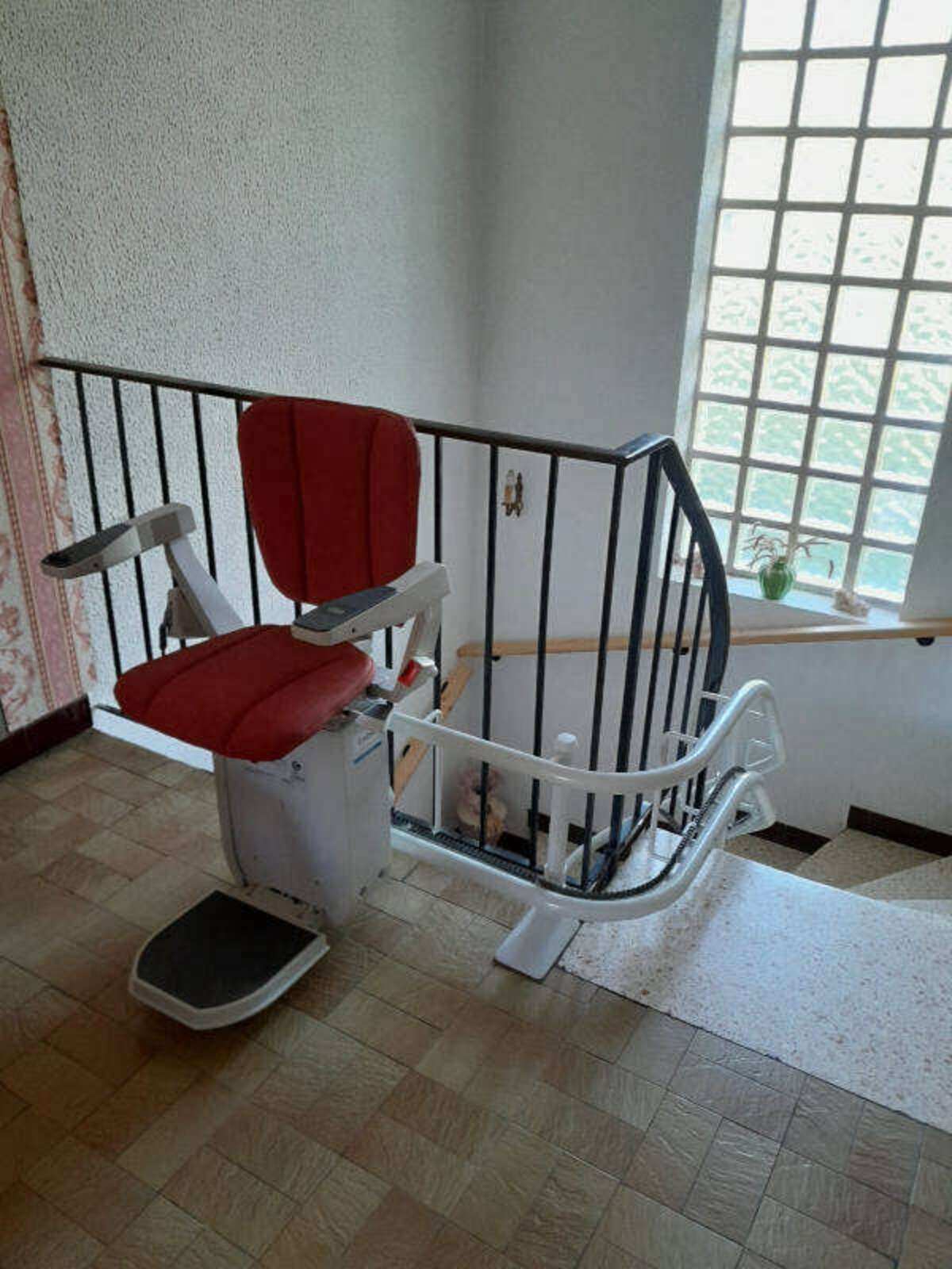L’installation de la chaise monte-escalier a été pensée pour faciliter son utilisation quotidienne avec son déambulateur, tout en optimisant l’espace : la porte arrière donnant sur un débarras inutilisé a permis une intégration harmonieuse du monte-escalier.