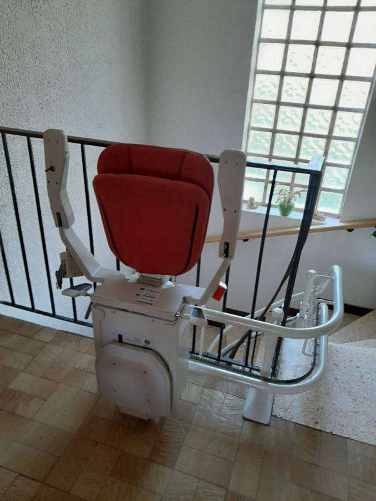 Le modèle de fauteuil élévateur appelé CURVE, a été choisi pour son adaptabilité aux escaliers tournants, et a été installé avec un rail double fin en acier de couleur beige et un siège rouge, pour une touche de personnalité.