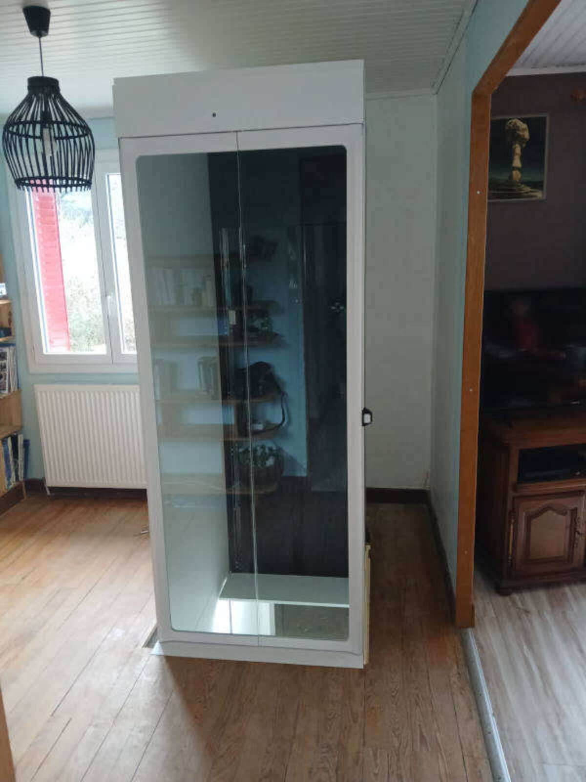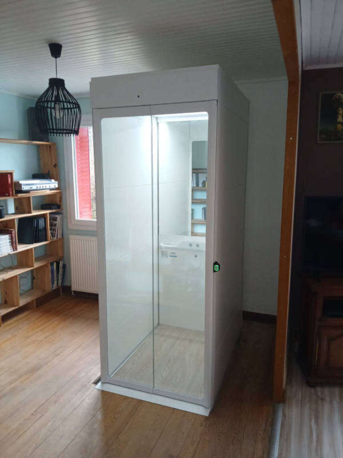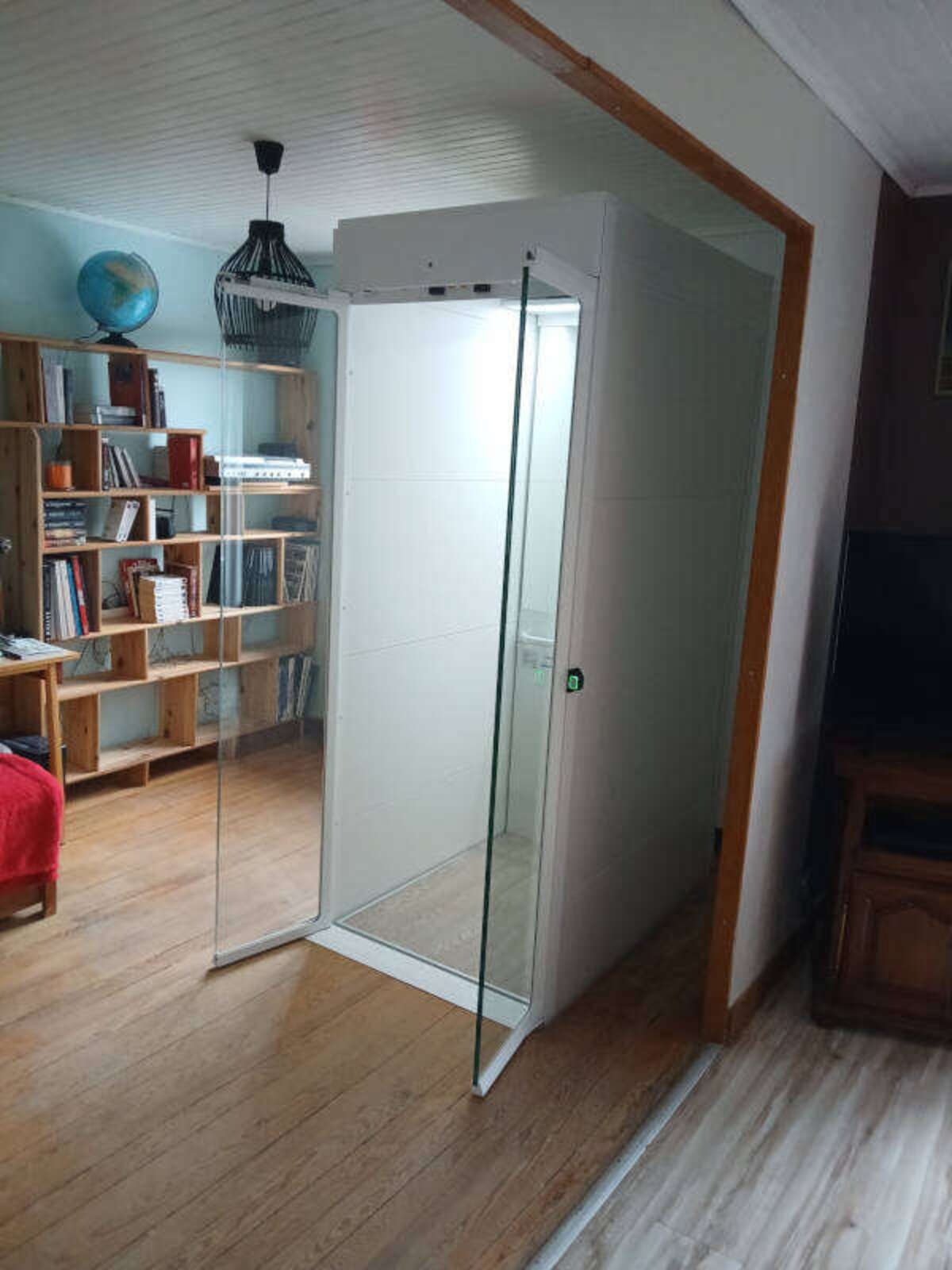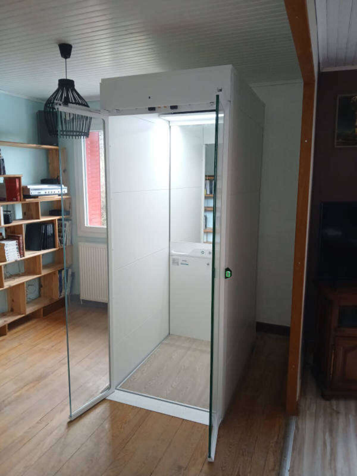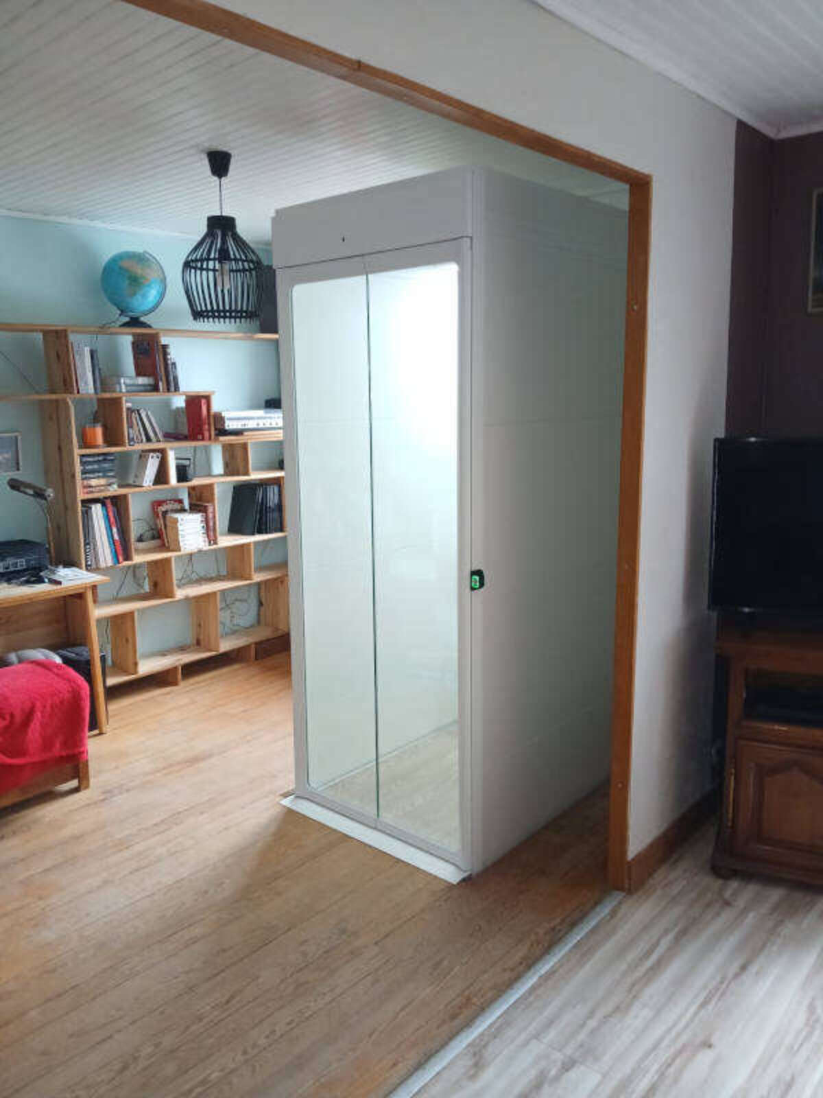Cet élévateur de personne dessert deux niveaux et est installé à l’intérieur de la maison, dans un pylône.