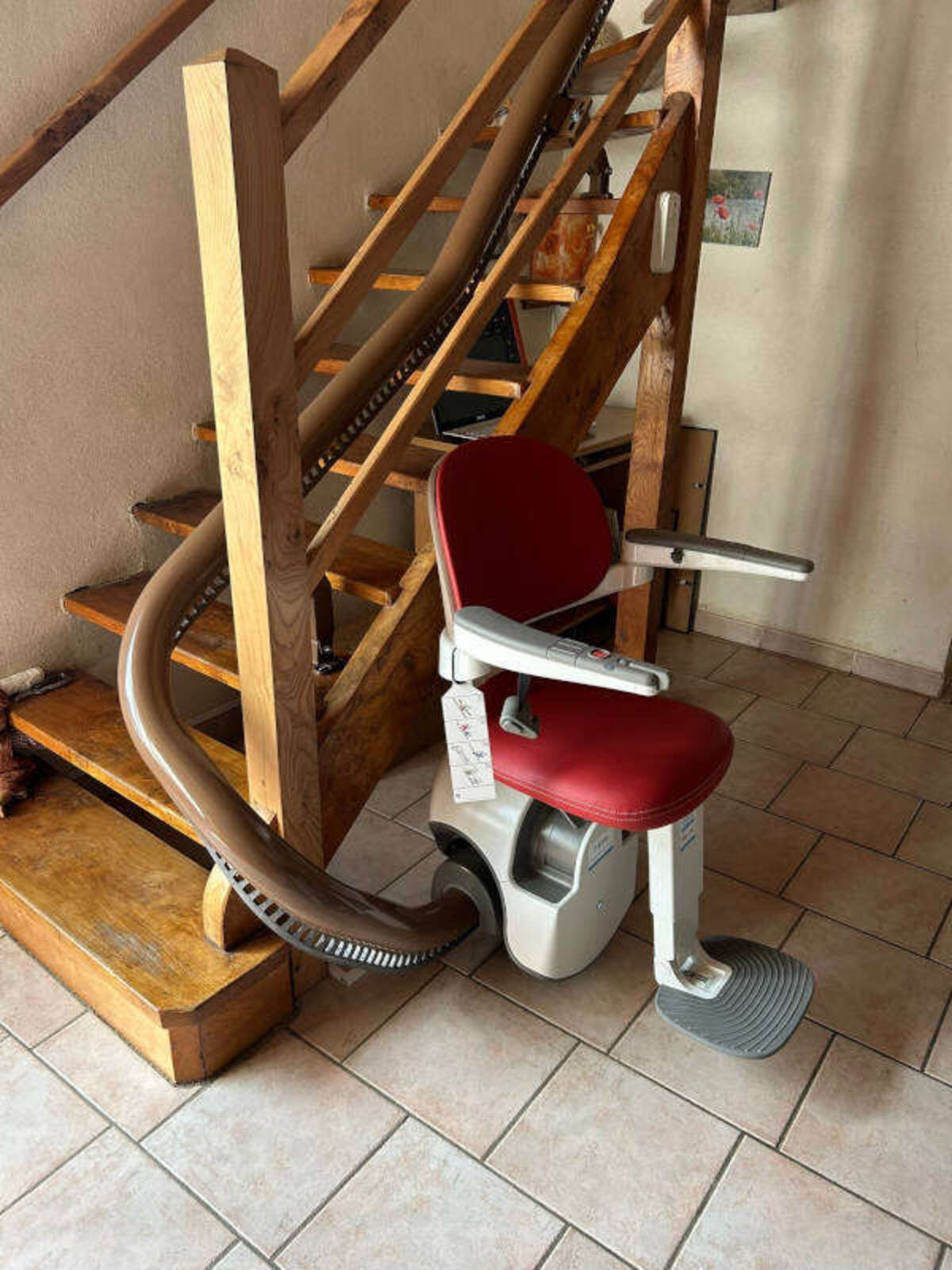 Le siège, de couleur rouge foncé, est équipé d’un système de pivotement automatique motorisé ASL, assurant confort et sécurité. Une ceinture de sécurité contactée empêche tout déplacement si elle n’est pas bouclée. Les accoudoirs du siège d'escalier offrent trois positions à l’arrêt, tandis que le repose-pied repliable se commande manuellement.