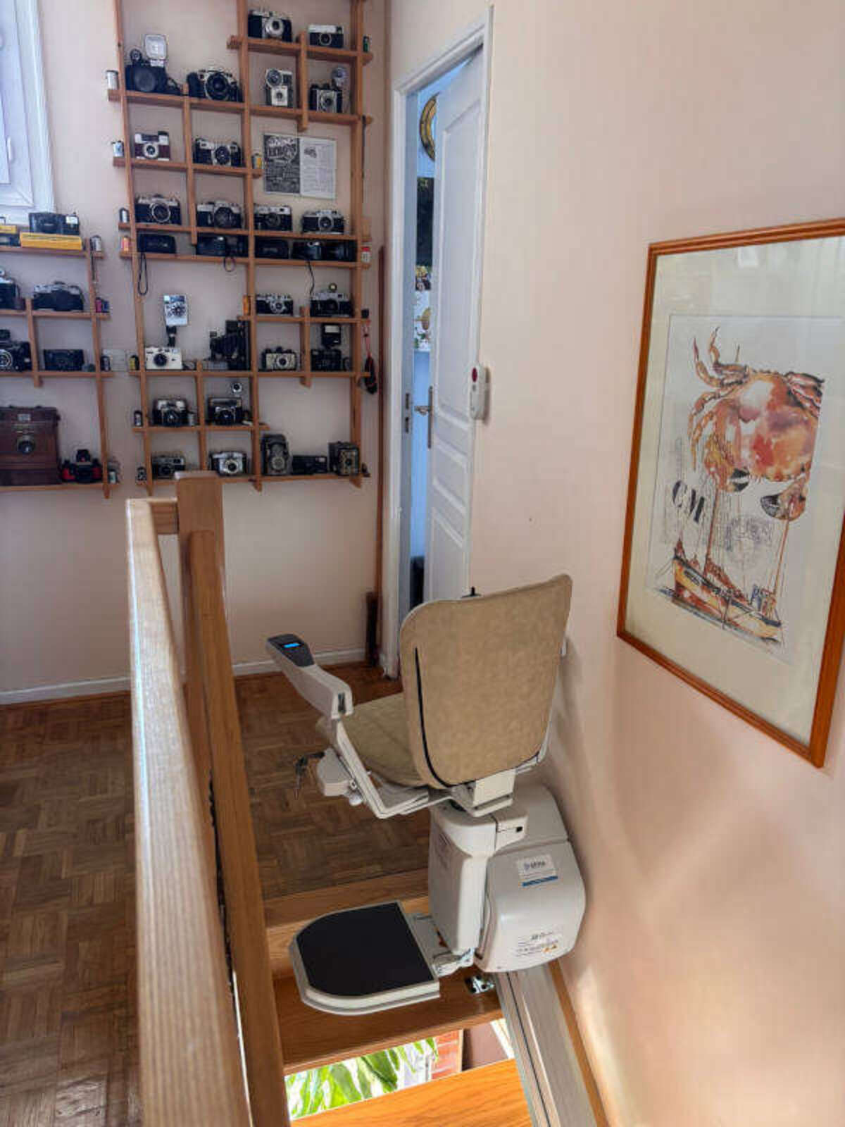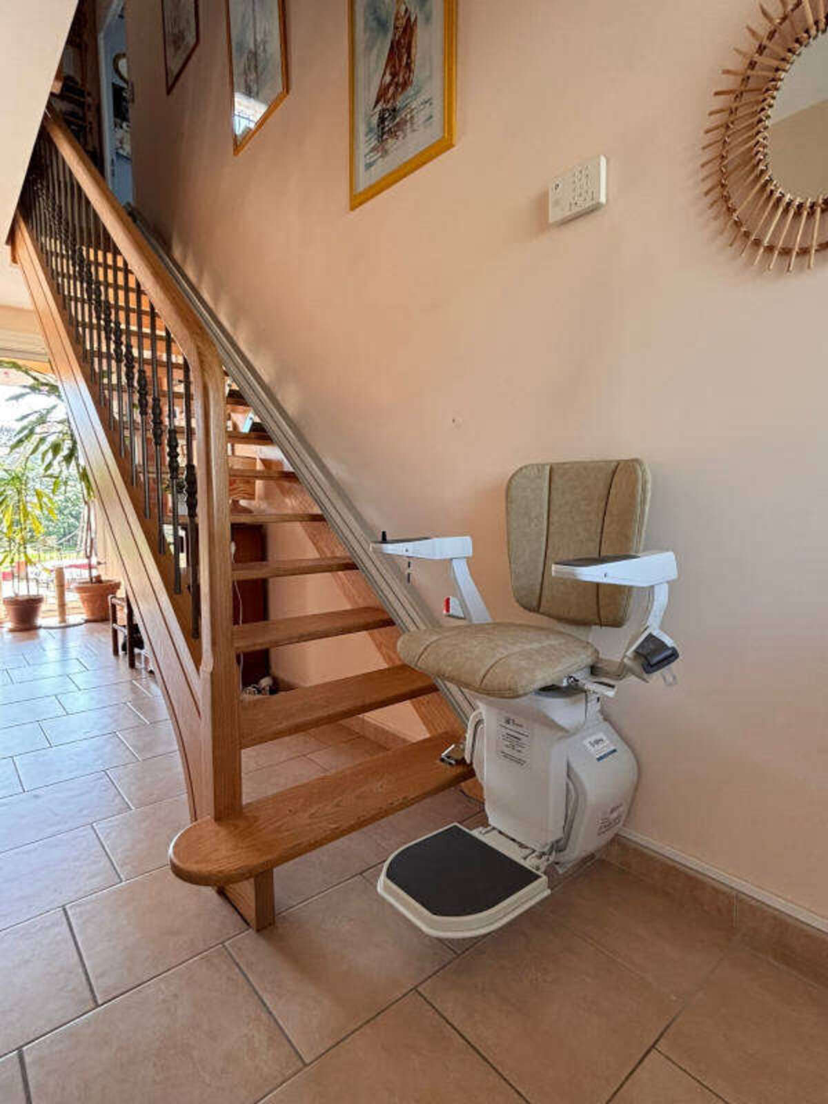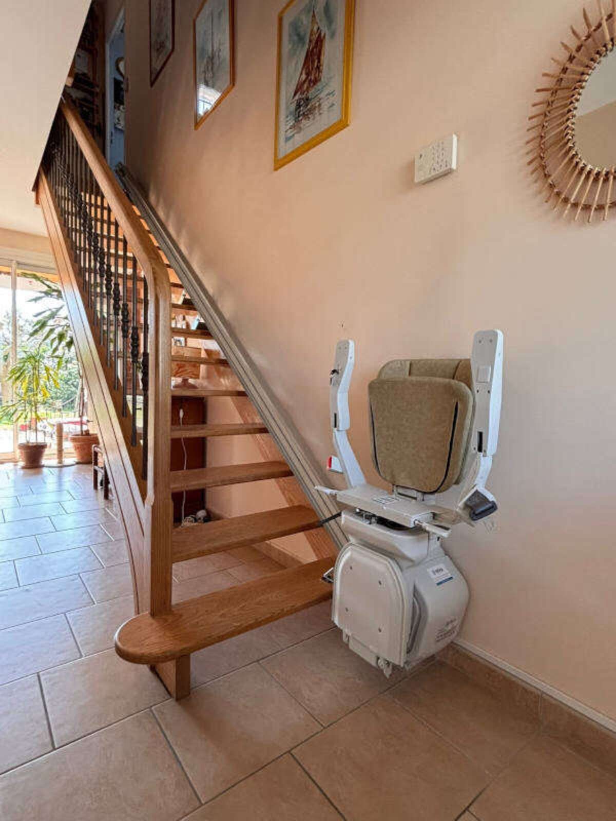 Le modèle retenu est la chaise monte-escalier droit « ERGO STRAIGHT » de la marque PLATINUM, avec un siège gris et son monorail d’une longueur de 4 500 mm, le rail en aluminium a été fixé directement sur les marches, du côté droit de l’escalier (vu du bas vers le haut).