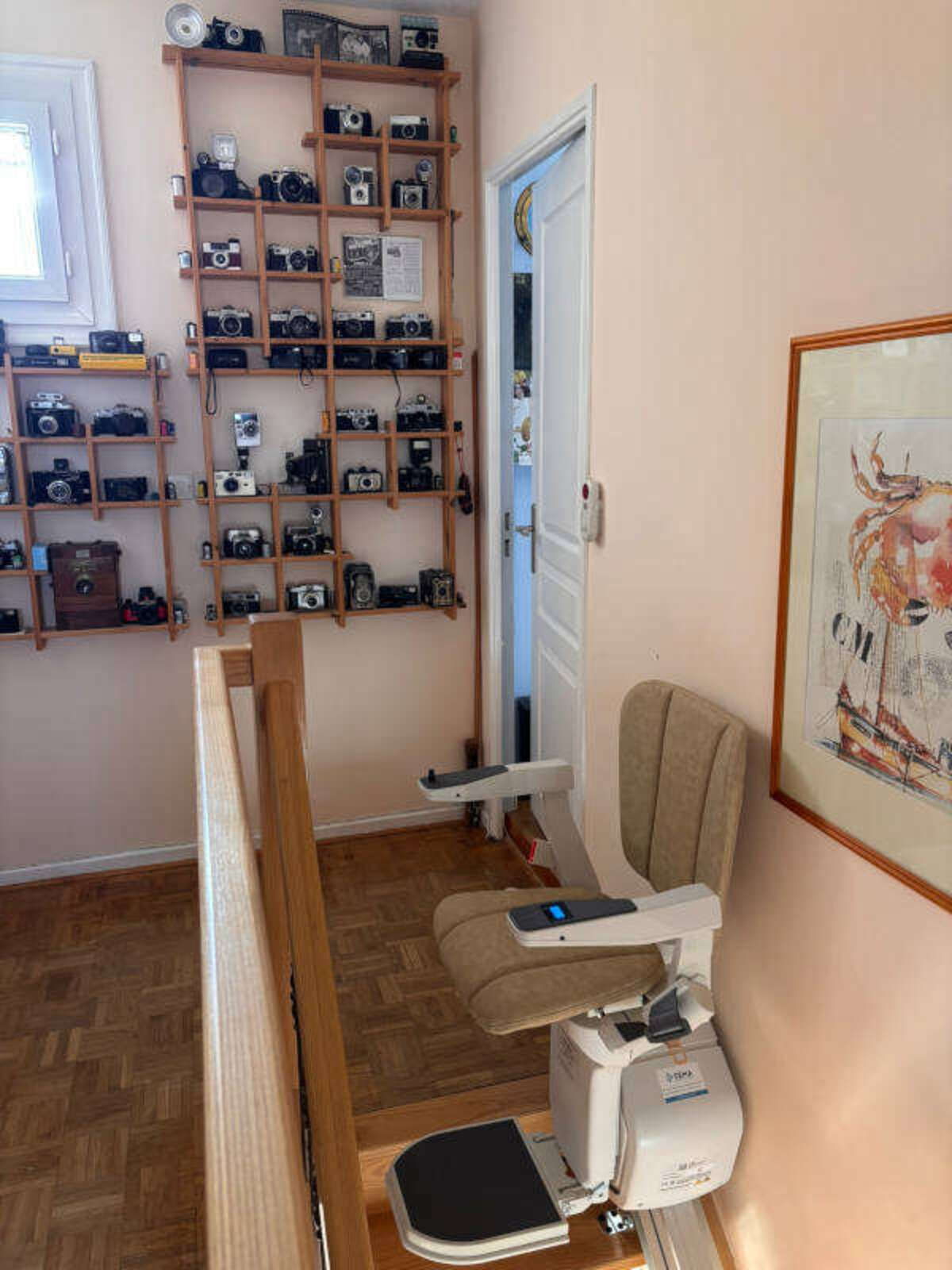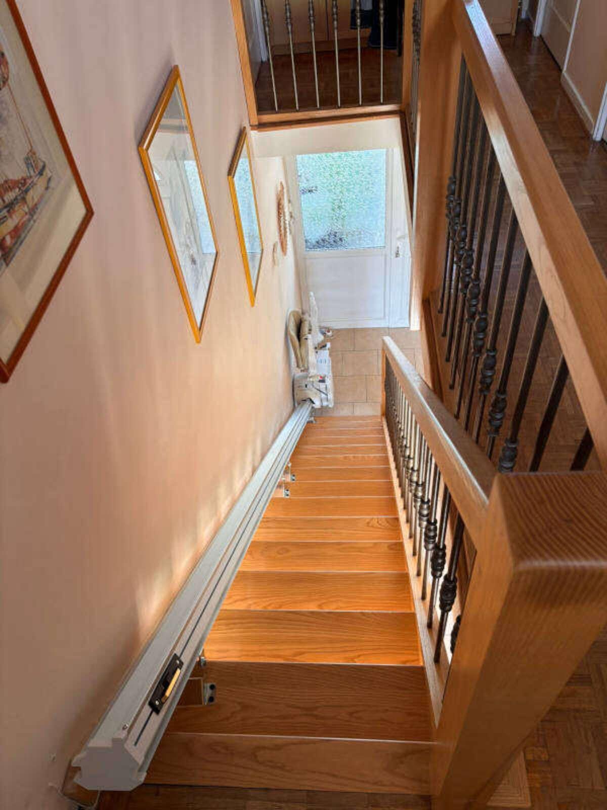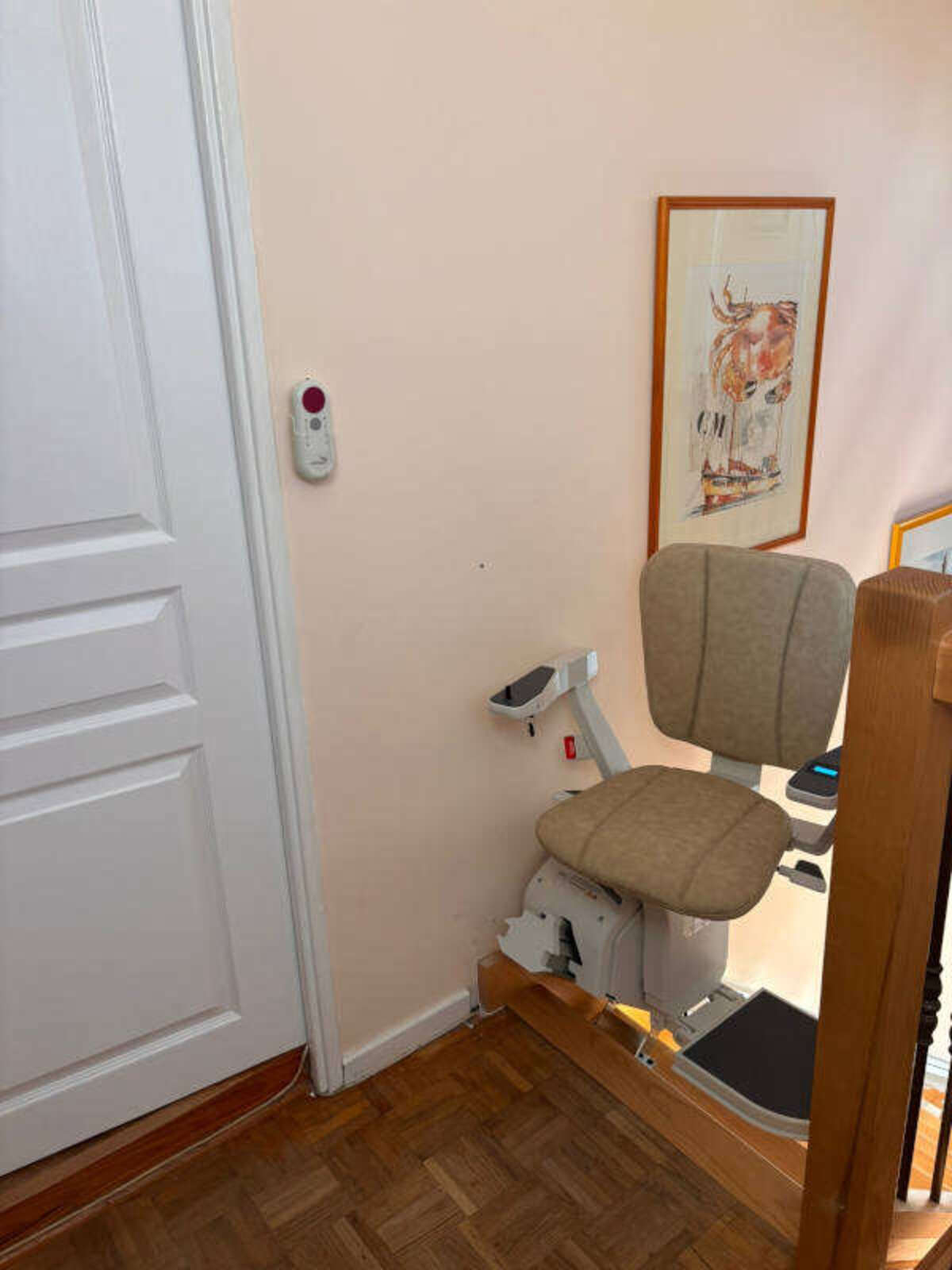 Le modèle retenu est la chaise monte-escalier droit « ERGO STRAIGHT » de la marque PLATINUM, avec un siège gris et son monorail d’une longueur de 4 500 mm, le rail en aluminium a été fixé directement sur les marches, du côté droit de l’escalier (vu du bas vers le haut).